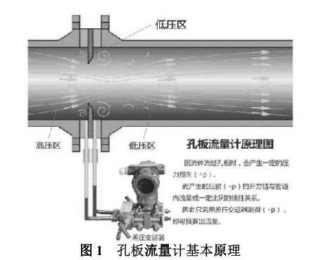 充滿管道的介質(zhì),當(dāng)它流經(jīng)管道內(nèi)的孔板流量計時,流速將在孔板處形成局部收縮,使得流速增加,靜壓力降低,孔板前后產(chǎn)生壓差,結(jié)構(gòu)原理如圖 1 所示。介質(zhì)流量越大,孔板前后的壓差就越大,通過測量壓差來計算流量的大小。