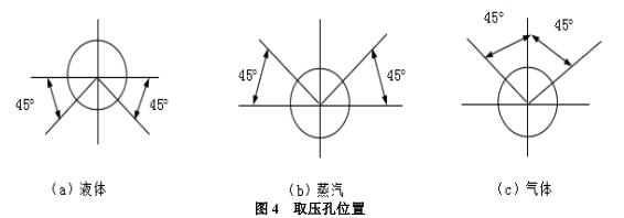 (1)取壓孔角度。測量介質(zhì)為氣體時,取壓孔設(shè)在管道上半部,與管道垂直中心線成 0°~45°夾角,可以避免引壓管積液;測量介質(zhì)為液體時,開孔在管道下半部,與水平中心線成 0°~45°夾角;測量介質(zhì)為蒸汽時,開孔在管道上半部,與管道水平中心線成0°~45°夾角,如圖 4 所示。