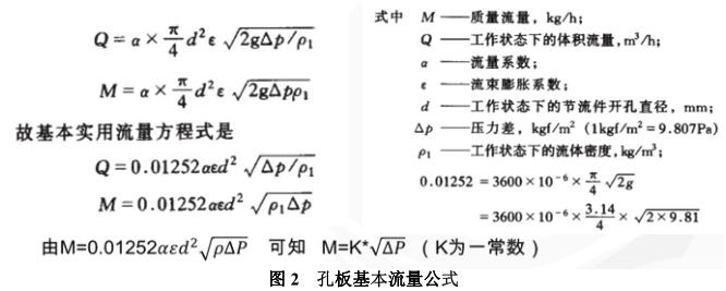 根據(jù)流體力學(xué)中的伯努利方程和流體連續(xù)性方程式可推導(dǎo)標(biāo) 準(zhǔn)孔板的流量與壓差之間定量關(guān)系的基本流量公式,如圖 2 所示。
