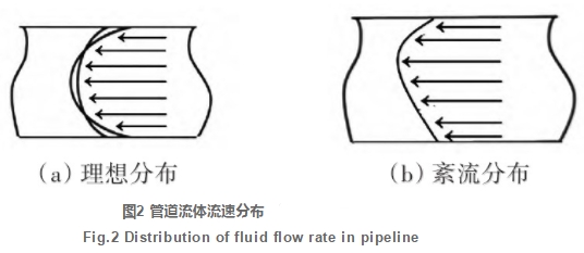(2)在圓形管道中流體充分發(fā)展后,管道中間的流速比較均勻,但是管壁處流速梯度較大。圖2(a)為理想流速分布,當雷諾數(shù)較小時弧度較大,對應流速差別也大。但由于現(xiàn)場管道安裝復雜(例如有大量彎管、閥門等),實際流速分布如圖2(b)所示。若流速越低,則不同位置流速差異越速同時伴隨著素流或渦流產(chǎn)生,所以在實際應用中管道內平均流速很難準確測得。