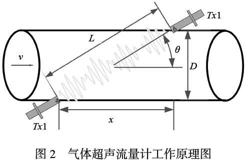 傳播時間差法氣體超聲流量計是通過測量高頻聲脈沖傳播時間得出氣體流量的速度式流量計,工作原理如圖2 所示。超聲脈沖在管道內(nèi)逆流和順流沿斜線方向傳播,傳播速度與介質(zhì)軸向平均流速有關(guān),通過測量聲波傳播時間差,運用數(shù)值計算法計算工作條件下通過氣體超聲流量計的氣體軸向平均流速和流量。在充滿氣體的密閉管道中,超聲波傳感器(探頭)沿管壁安裝,直接與氣流接觸,2 個傳感器發(fā)射超聲波后由對方互為接收。圖2 中a、b 為2 個超聲波流量計換能器,聲道與管道傾斜夾角為θ,管道內(nèi)徑為D,聲道長度為L,聲道距離為x。在一些流量計中采用了反聲道,此時聲脈沖在管壁上經(jīng)歷一次或多次反射。