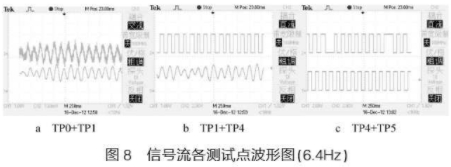 本設(shè)計(jì)在50mm口徑渦街流量計(jì)實(shí)驗(yàn)裝置上進(jìn)行試驗(yàn)。圖8所示為信號(hào)流各測(cè)試點(diǎn)波形圖。圖8a上方的波形為前置放大后.輸出的波形(TPO),壓電傳感器輸出的差分信號(hào)經(jīng)前置儀表放大器輸出轉(zhuǎn)換后,得到的正弦信號(hào),但信號(hào)信噪比相對(duì)較差;下方的波形為經(jīng)過測(cè)量通道濾波輸出之后的波形(TP1),經(jīng)過濾波去噪放大處理,得到的高信噪比信號(hào)。圖8b下方波形即是經(jīng)過測(cè)量通道濾波輸出之后的波形(TP1);上方波形為經(jīng)過軟件脈沖整形之后輸出的方波信號(hào)(TP4),對(duì)于峰峰值大于設(shè)定閾值的模擬信號(hào),軟件脈沖整形都能正確輸出方波。圖8c.上方波形即為經(jīng)過軟件脈沖整形之后輸出的方波信號(hào)(TP4),因?yàn)橛写嬖谛∮诿}沖整形閾值的信號(hào),致使輸出方波存在缺波現(xiàn)象;下方波形為經(jīng)過功率最大頻率點(diǎn)周期估計(jì)之后輸出的波形(TP5),通過軟件濾波最大程度的復(fù)原了真實(shí)的信號(hào)波形,保證了測(cè)量精度。