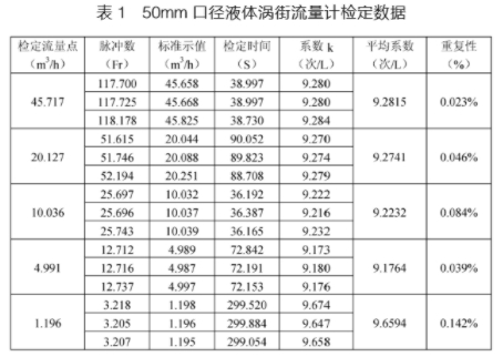 在開發(fā)過程中,渦街流量計(jì)的校準(zhǔn)檢定是必不可少的。通過校準(zhǔn)可以確定渦街流量計(jì)的性能指標(biāo),尋找影響儀表特性的各種因素,為提高儀表性能提供依據(jù)。本文對(duì)50mm口徑液體渦街流量計(jì)采用靜態(tài)容積法進(jìn)行校準(zhǔn)檢定,其流量檢定范圍為1~50m³/h,流量檢定點(diǎn)分別為2%、10%、20%、40%.91%五點(diǎn)。具體檢定數(shù)據(jù)如表1所示: