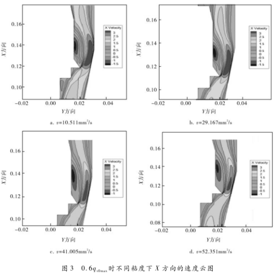 為了直觀地反映同一流量點不同粘度下流量傳感器中速度的變化,選取0.6qyDmax時不同粘度.下X方向速度進行分析,速度云圖如圖3所示。