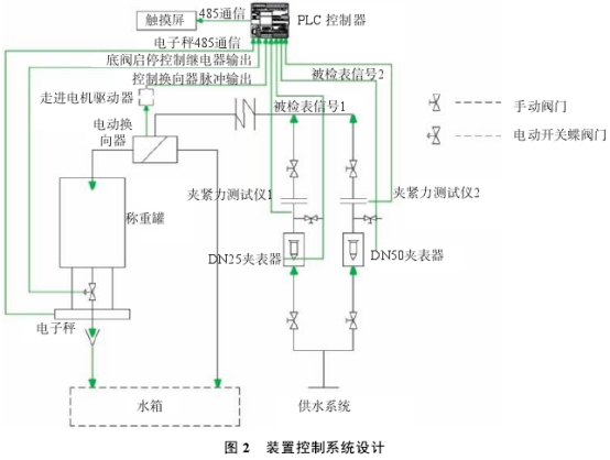 金屬管浮子流量計裝置控制部分主要包括夾緊力控制系統(tǒng)、換向器控制系統(tǒng)和稱重控制系統(tǒng)(圖2),獲取電子稱讀數(shù)、控制夾表器、控制換向器動作、控制底閥開關、脈沖計數(shù)等由計算機完成。在夾緊力控制系統(tǒng)的設計,上,考慮到被檢浮子流量計容易損壞,在每個夾表器.上安裝夾緊力傳感器(夾緊力測試儀1和夾緊力測試儀2)。當夾緊力過大時,由計算機進行夾緊力超限報警,提示操作人員停止夾緊動作;換向器控制系統(tǒng)中,換向器是液體流量裝置的重要組成部分,其不確定度大小對裝置整體合成不確定度有較大影響1011)影響換向器精度的主要因素是實際注水時間和觸發(fā)光電信號所產生時間之間的誤差凹本裝置采用步進電機驅動分水器換向,由PLC發(fā)送脈沖控制電機轉速、加速度和轉動角度。通過PLC的高速脈沖輸出通道,向換向器的步進電機驅動器按照勻加速-定速勻減速的方式發(fā)送脈沖,換向器電機帶著換向器導流體進行加速-勻速-減速的運行。精確控制換向器運動,保證裝置不確定度水平;稱重控制系統(tǒng)中,裝置主標準器高精度電子秤通過485通信模式,將傳感器讀數(shù)傳輸至PLC控制器,實現(xiàn)實時數(shù)據(jù)采集。