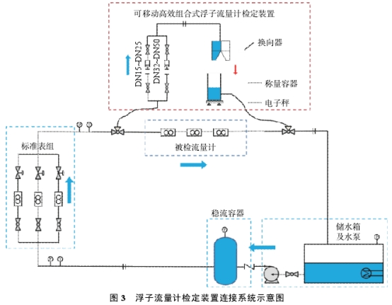 金屬管浮子流量計檢定裝置和液體流量裝置連接后的系統(tǒng)示意圖如圖3,組合裝置由儲水系統(tǒng)、水源循環(huán)穩(wěn)壓系統(tǒng)、變頻調速系統(tǒng)、裝夾表系統(tǒng)、水流換向系統(tǒng)、計算機控制系統(tǒng)、標準器和儀表檢定管線系統(tǒng)組成。在水流量裝置管段前后安裝三通閥和預留旁路,通過控制三通閥實現(xiàn)水流在試驗管路和旁路之間的切換,三通閥的一端分別通過軟管與可移動浮子流量計檢定裝置的人、出口相連,形成浮子流量計檢定回路。浮子流量計檢定裝置和液體流量裝置連接成高效組合裝置,將水平流場轉換成適合浮子流量計檢定的垂直流場。