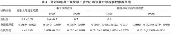 通過對孔板流量計各結構參數的模擬研究,明確了在進行超臨界二氧化碳工質質量流量測量時,孔板流量系數隨各結構參數的變化趨勢與相對誤差,本節(jié)主要對以上模擬結果進行總結分析,參考《用能單位能源計量器具配備和管理通則》中的準確度規(guī)定,,給出了針對超臨界二氧化碳工質的孔板流量計結構參數推薦設計范圍,在該范圍內經驗計算公式的計算結果可滿足2.5準確度等級要求,還進一步提出了該范圍內精度相對更高的結構參數推薦值,將以上結果與現行國際標準ISO5167-2:2003中標準孔板流量計各結構參數的規(guī)定范圍進行對比,如表4所示。
